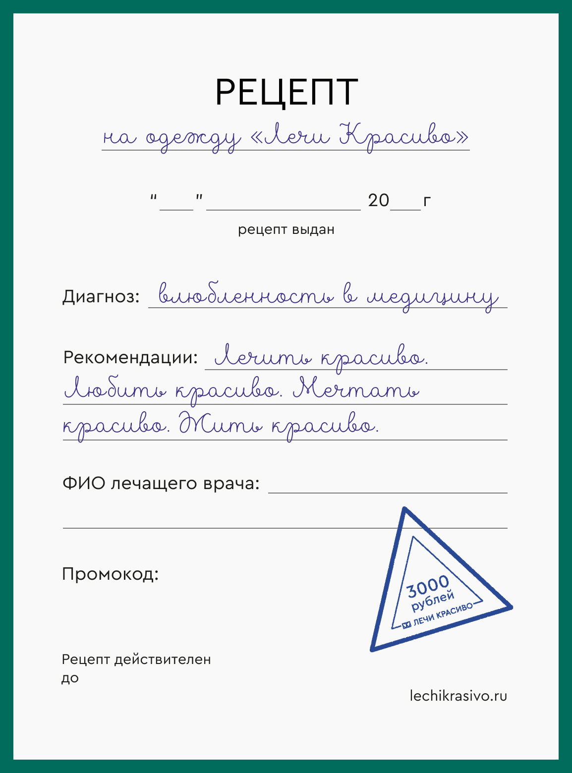 Это не просто сертификат, а особенный знак внимания, оформленный в виде медицинского рецепта с диагнозом «влюблённость в медицину».